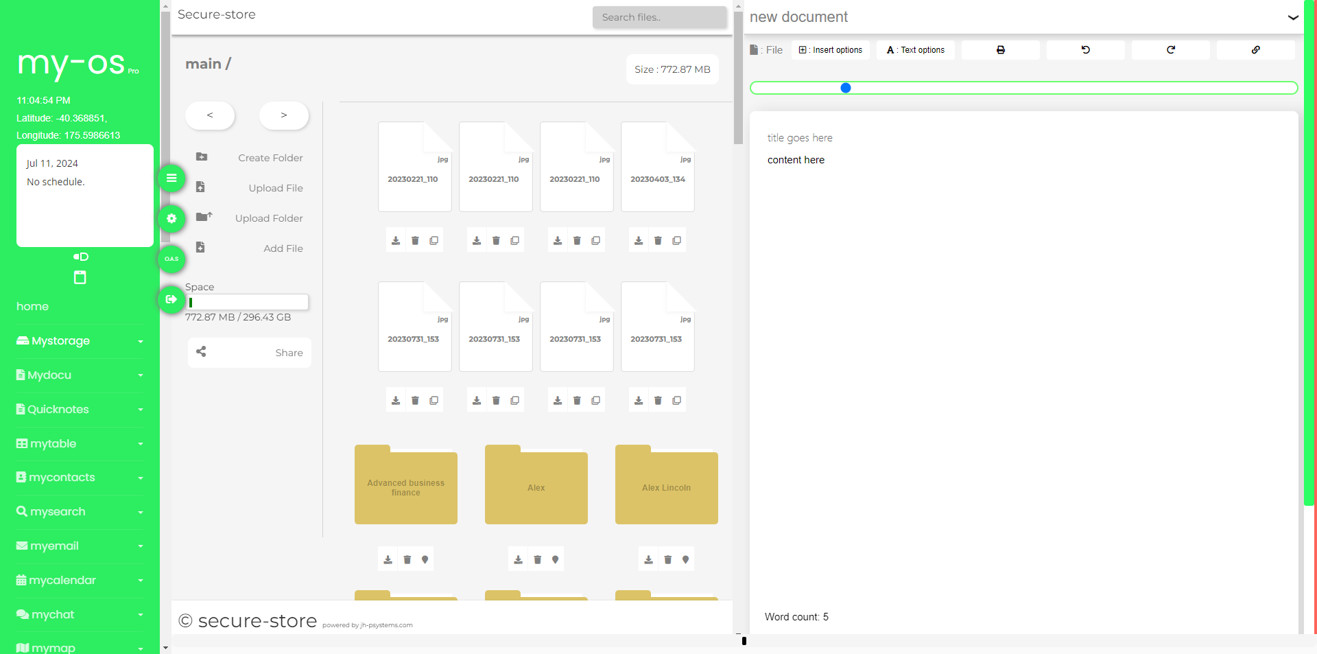 My-OS offers secure file storage, document and table creation, calendar and contact management, invoicing, custom program integration and so much more. Experience seamless workflow and unmatched customizability with My-OS.